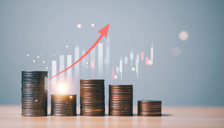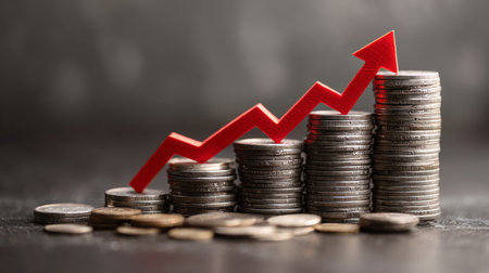 This image showcases stacks of coins with a red upward arrow representing financial growth, profit, and successful investment strategies in a business setting.