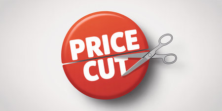Red circle with scissors cutting out the words PRICE CUT on a light gray background