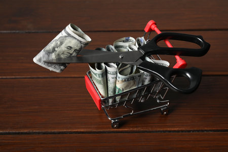 Dollar banknotes, scissors and small shopping cart on wooden table