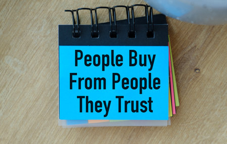 A blue notebook with the words People Buy From People They Trust written on it. The notebook is made up of several colorful sticky notes