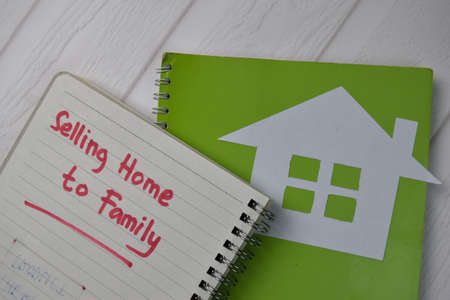 A wooden cube with the letter the word HOME with the miniature white home background. The conceptual image of first home and saving for buy home.