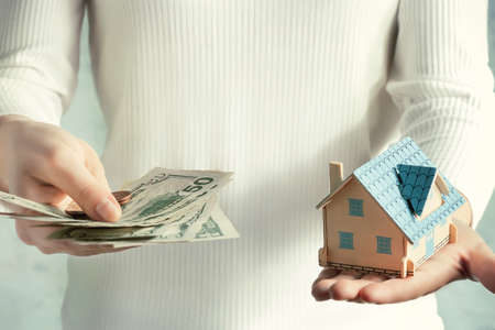 Real estate price and construction concept. Girl weighs money and a toy house in her hands