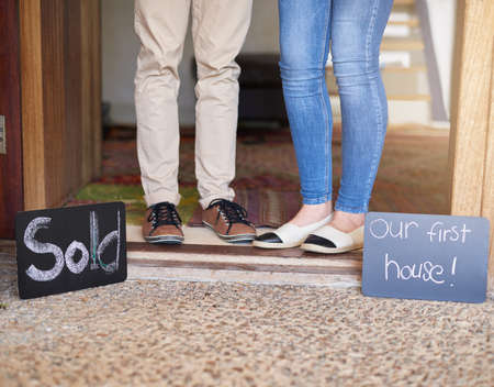 Walking into our new beginning. Shot of an unidentifiable young couple standing in the doorway of their new home on moving day.