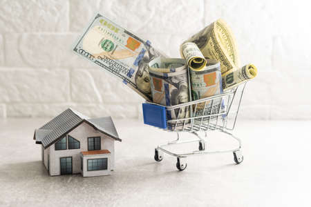 House in Supermarket Trolley and purse with american dollars. Home buying or selling. Credit housing or renting an apartment. Miniature Home for family with Hundred Dollar Bills. Real Estate Investing