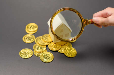 A small white model home with Cryptocurrency bitcoin ,bitcoin mining and financial concept