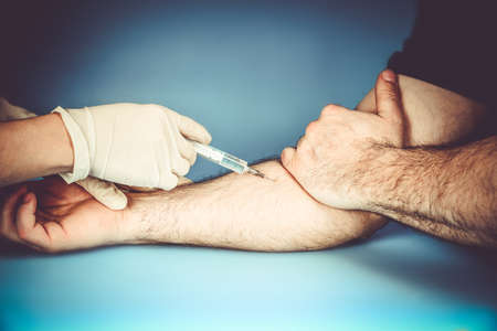 the doctor collects blood in a syringe, Nurse takes blood from the veins on the arm.