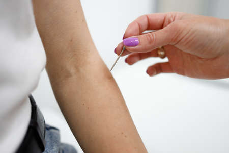 Close-up view of a neurologist doctor checking reflexes on a female patient's hand with a special needle. Diagnosis of neurological diseases in the clinic
