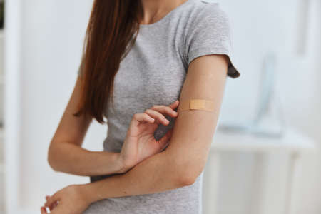 Close up doctor's hand vaccinating against coronavirus Covid 19 to a young man in the office of a medical clinic