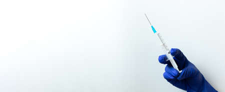Doctor holding medical syringe with a needle on a white background, banner, copy space, blue gloves photo