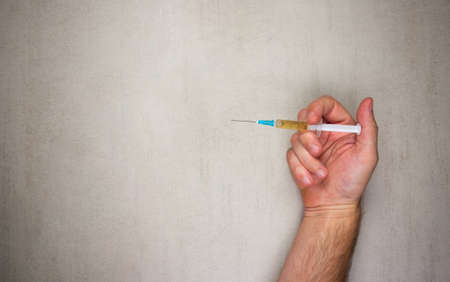 Male hand with disposable syringe for injection on a gray background. mock up for text, phrases, lettering