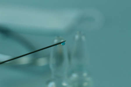 vaccination drop blood medication on a needle on a blue blue background with a copyspace.