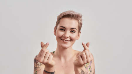 Spread Love. Portrait of cheerful half naked tattooed woman with pierced nose and short hair smiling at camera, showing Korean heart sign isolated over light background
