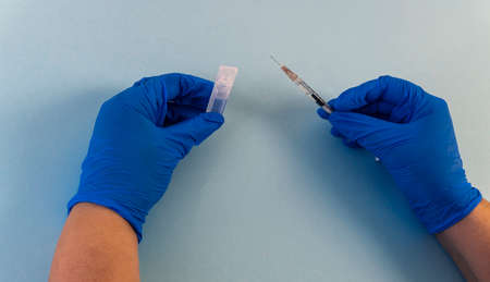 Hands in medical gloves holds a test tube with a syringe on blue background