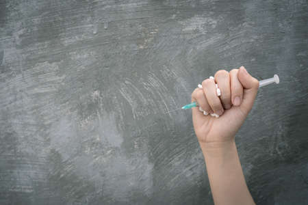 Stop drug addiction concept. Young human hand crushing white pills and syringe with fist over concrete wall background. International Day against Drug Abuse. Copy space.