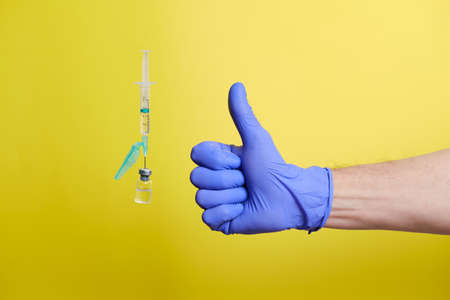 Coronavirus vaccine, syringe for injection and a hand in a medical glove on a blue background. Coronavirus vaccination concept