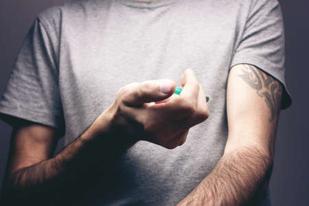 Man drugs addicted injecting heroine in his arm at the table with other drug on black background in the dark