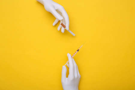 White hands of a mannequin hold a syringe and cigarette on yellow background. Drug and smoking addiction