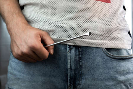 The guy is holding a screwdriver in his hand. Construction tool for screwing screws.