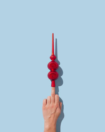 Red Christmas tree topper decoration on middle finger against blue background. MInimal new year concept. Flat lay creative idea