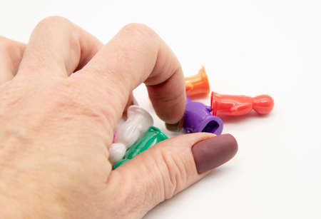 Set of push pins in different colors, with real shadows, isolated on white background - macro