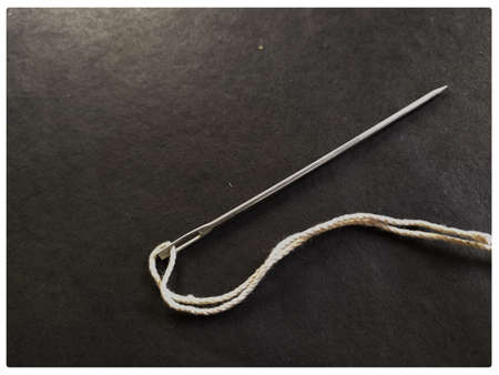A hand thread a thread through the eye of a sewing needle. Sewing and needlework classes.Craft and handmade workshop.Workplace in the textile industry. Needle for embroidery by hand