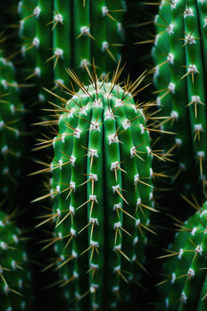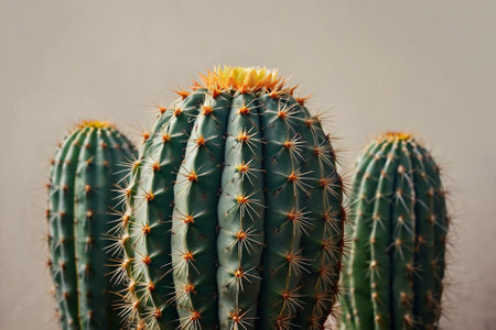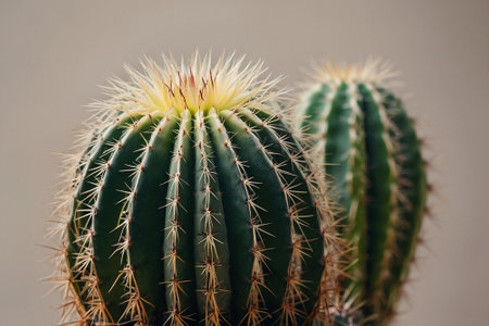Close-up of a green cactus with sharp thorns against a light background, showcasing its unique texture and resilience. Ideal for nature and botanical themes.