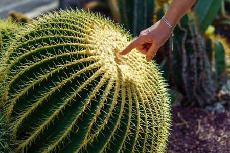 Huge cactus with sharp skewers and womans hand lightly touching the plant.