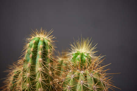 Real nature beauty background. Close-up Dark green oblong cactus prickly yellow needles. Floral concept, decoration, plant breed class, loneliness conflict difficult character situation, sharp joke