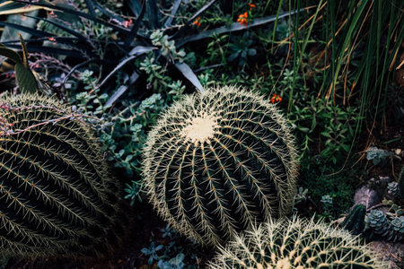 Barrel cactus, Clumping of big succulents plants with round shapes and sharp thorns in the rock garden. (Ferocactus)