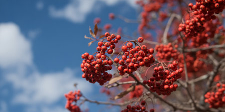 detail of Rowan Berries (Sorbus aucuparia) against of blue sky