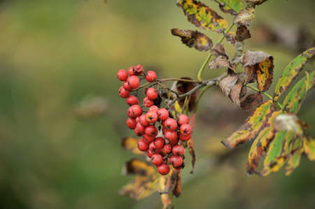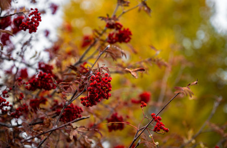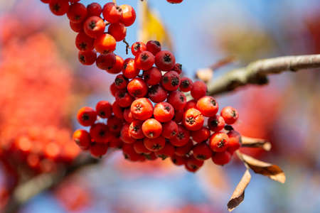 Close up of bunches of rowan berries and dry leaves on autumn brunches