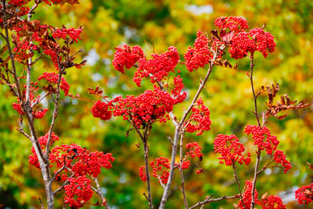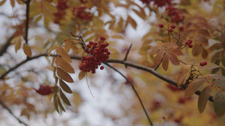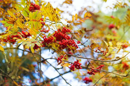 Ripe bunch of rowanberry or mountain ash on tree branches of rowan with yellow leaves in autumn time. The concept of the seasons.
