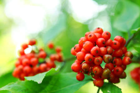 A bright red bunch of rowan berries on a background of green foliage. Natural background