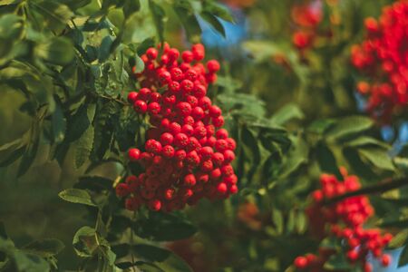 Bunches of ripe rowan berries on branches of rowan tree on sunny day