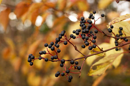 Blurred image of a branch with elderberries on a background of autumn trees. Autumn background