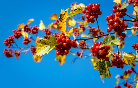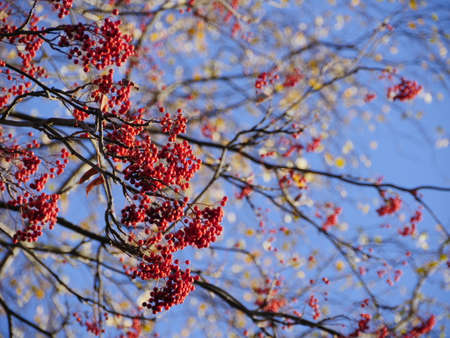 Branches of autumn mountain ash or rowan with bright red berries against the blue sky background