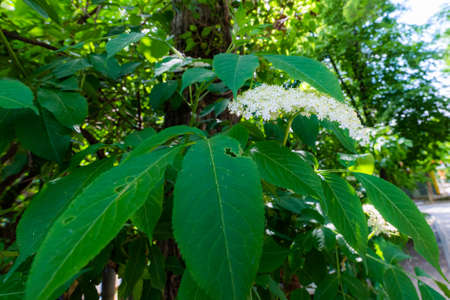 Elderberry Red (Sambucus racemosa) shrub with berries and green leaves in the garden in summer.