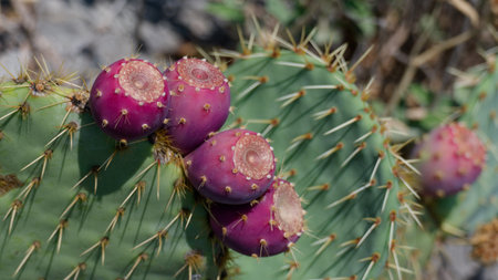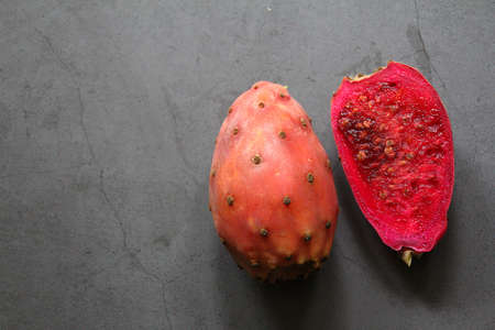 Close up of fruits of prickly pear. Tasty fruits of desert plant.