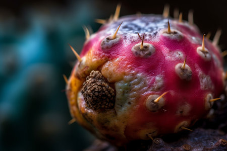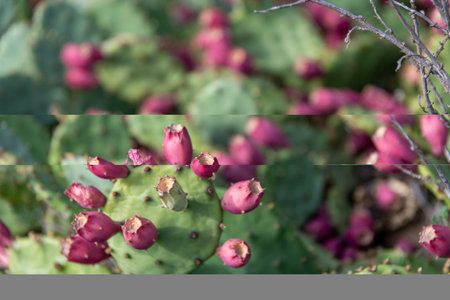 Prickly pear cactus close up with fruit in red color, cactus spines.