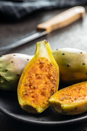 Raw prickly pears. Opuntia or indian fig cactus on plate.