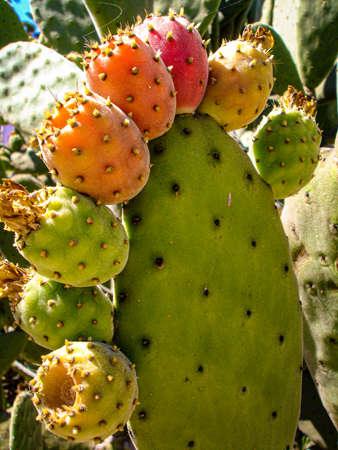 Prickly pear cactus fruits in the garden. Prickly pear cactus with fruits.