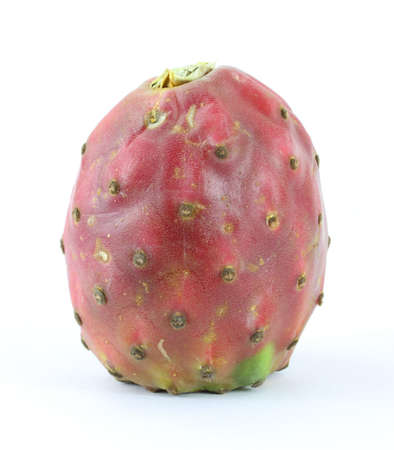This image features a prickly pear cactus adorned with bright red fruits, showcasing its unique textures and vibrant colors against a clean white background.