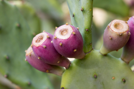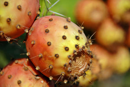 Close up of fruits of prickly pear. Tasty fruits of desert plant.