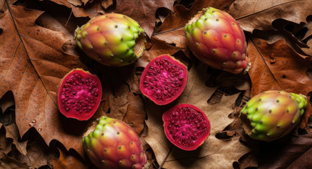 Realistic photo of a bunch of prickly pears. top view fruit scenery
