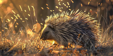In the warm glow of dusk, a porcupine navigates through a forest floor scattered with fallen leaves. The soft sunlight accentuates its unique quills as it searches for food.