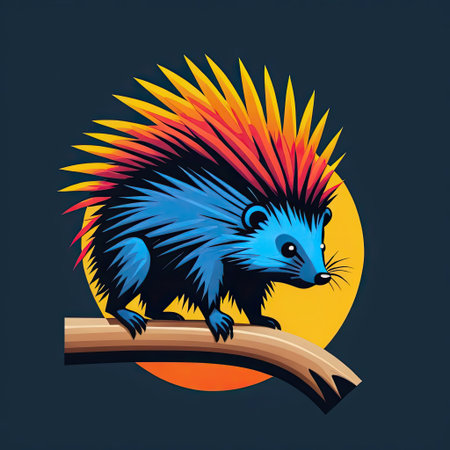 A striking porcupine stands on a branch, displaying a vivid array of colors in its quills. The animal contrasts beautifully with the warm hues of a sunset in the background, capturing a dynamic and artistic representation of wildlife.