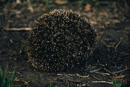 Hedgehog scenting danger curled up in a ball exposing needles