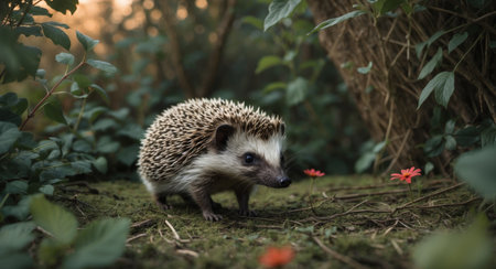 AI Generated. Free Roaming Wild Hedgehog in a Wildlife Garden Hide Capturing the Agile and Curious Mammal as it Forages in its Natural Habitat at Twilight