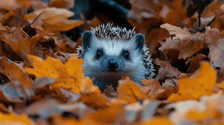 Hedgehog peeking out from behind autumn leaves, its spines and ears visible among the colorful foliage of yellow and brown leaves