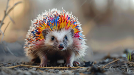 Colorful hedgehog with rainbow spikes walking in autumn leaves.
